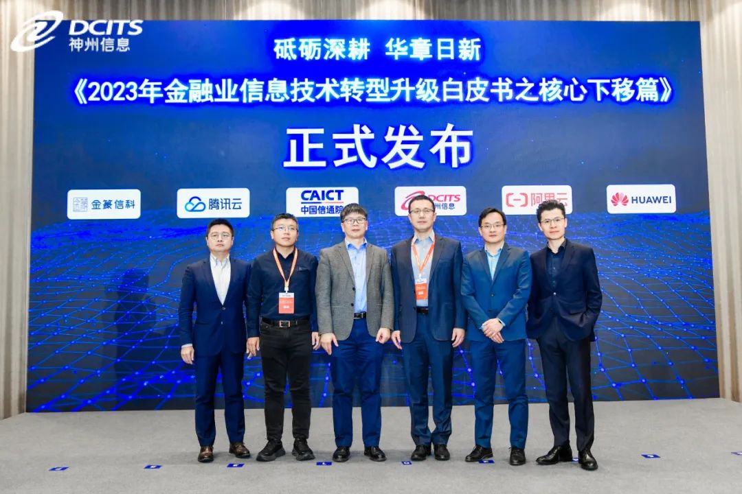 在本次大会上, BB贝博艾弗森官网联合中国信通院、阿里云、腾讯云、华为、金篆信科等单位共同发布了《砥砺深耕,华章日新—2023年金融业信息技术转型升级白皮书之核心下移篇》(以下简称“白皮书”),BB贝博艾弗森官网副总裁马洪杰(上图右三)、中国信通院副总工程师石友康(上图左三)、阿里云新金融事业部副总经理 宋勇(上图右二)、腾讯金融云副总经理王丰辉(上图左二)、华为数字金融军团分布式新核心业务总经理韩满(上图右一)、金篆信科副总经理张校逸(上图左一)等嘉宾共同出席发布仪式,BB贝博艾弗森官网金融技术部总经理张劲(下图)作为代表对白皮书进行了解读。